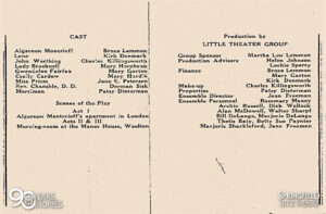 Recent graduates of Springfield Senior High – now Central High School – Bruce Lemmon and Kirk Denmark sought a reprieve from the burdens of the Depression. With job prospects scarce, they dedicated their summer to producing Oscar Wilde’s classic comedy, THE IMPORTANCE OF BEING EARNEST. Under the guidance of drama teacher Helen Johnson, the young men recruited six friends – Mary Garton, Dorman Sisk, Mary Hardin, Charles Killingsworth, Mary Hornbeck, and Jane Peterson – to join their cast. The group raised 56 $1 donations from area business owners, and the funds secured a one-night only booking at Clara Thompson Hall on Drury campus.