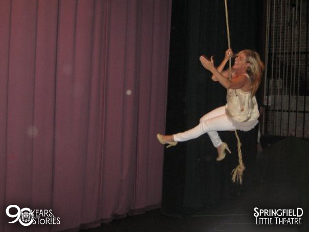 - Marty Chaney swings in from stage right on a rope swing at The Landers Theatre for reasons unknown — typical Marty.