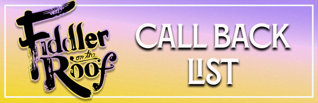 Thank you so much to everyone who auditioned for Fiddler on the Roof! We would like to see the following people tonight at 7:00 on the Landers’ stage for movement, singing, and cold readings. Please wear comfortable clothing that does not restrict movement and character shoes or hard-soled shoes. No tennis shoes, please. Younger men are encouraged to bring knee pads, if you have them. Please continue to review the posted sides and sheet music. We will dismiss groups of people as the evening progresses. Thank you!