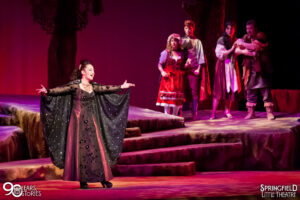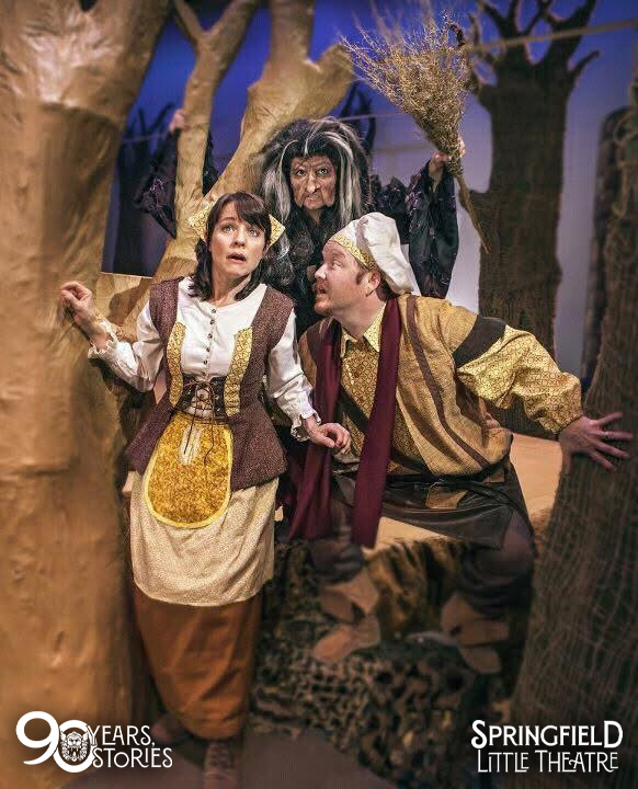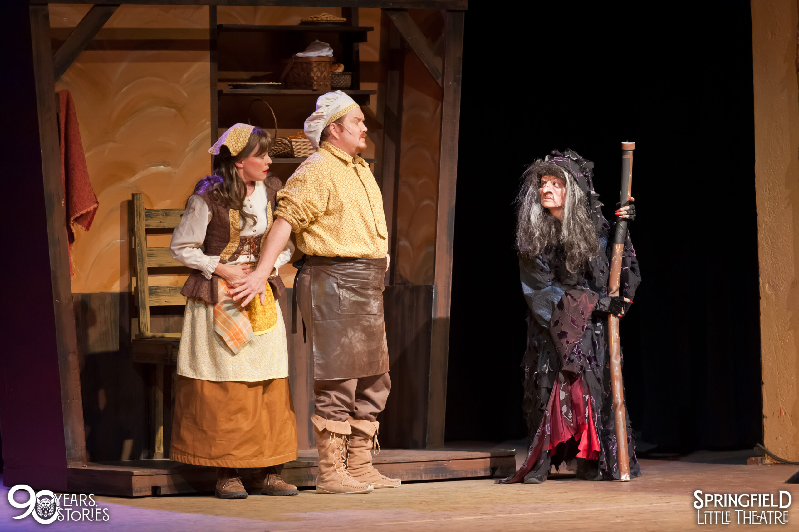 - A press photo for Springfield Little Theatre’s 2011 production of INTO THE WOODS, with Kylie Stack (center) as The Witch, Kim Crosby (left) as The Baker’s Wife, and Patrick Schuster (right) as The Baker.